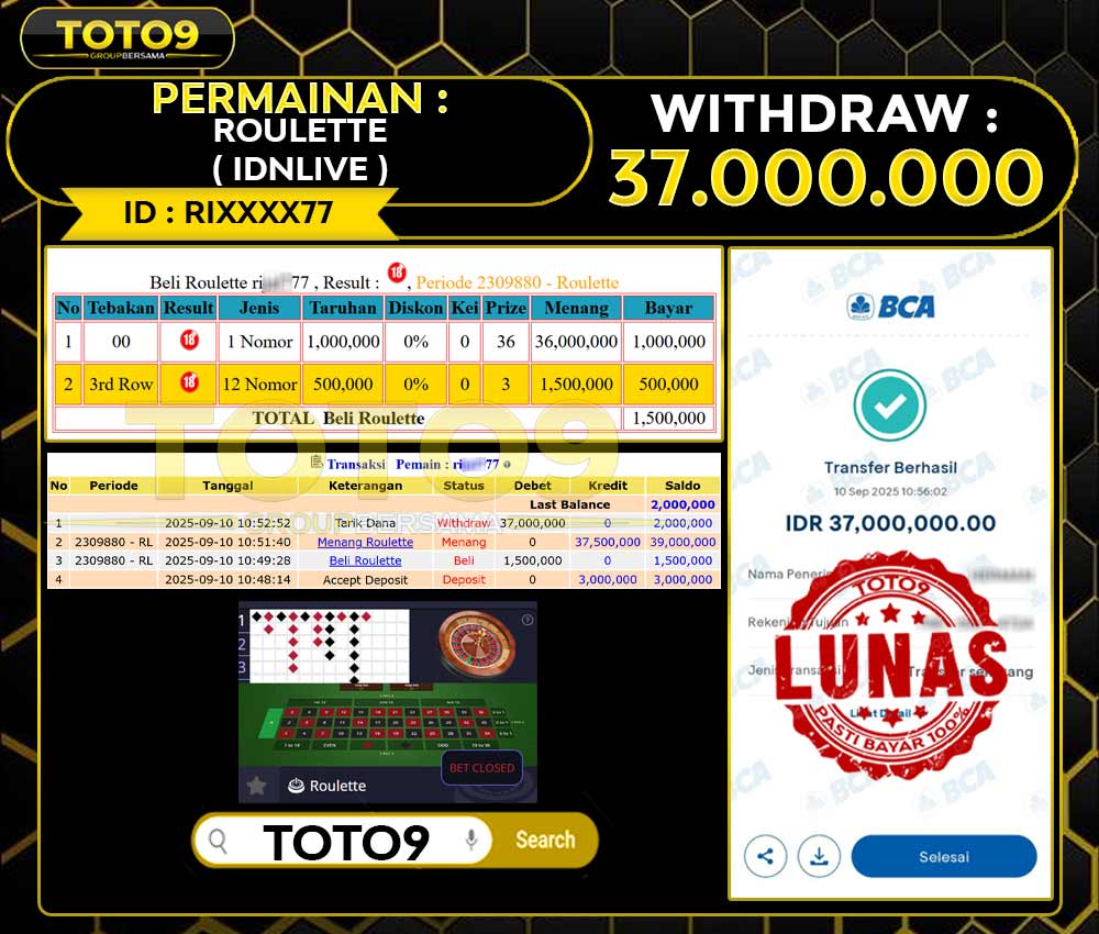 Selamat kepada User id : RI***77 Telah berhasil mendapatkan kemenangan besar pada permainan LIVE GAME ROULETTE ( IDNLIVE ) kemenangan Sebesar Rp37.000.000 , Setelah mengisi formulir withdraw dengan kurung waktu hanya 3 – 5 menit pihak toto9 sudah melakukan transfer kepada pemilik Userid dan dana sudah dapat di cairkan oleh pemenang. Bukti pembayaran yang kami berikan merupakan bukti pembayaran yang SAH / VALID yang langung di dapatkan melalui tanda transfer transaksi dari Bank yang di tuju.