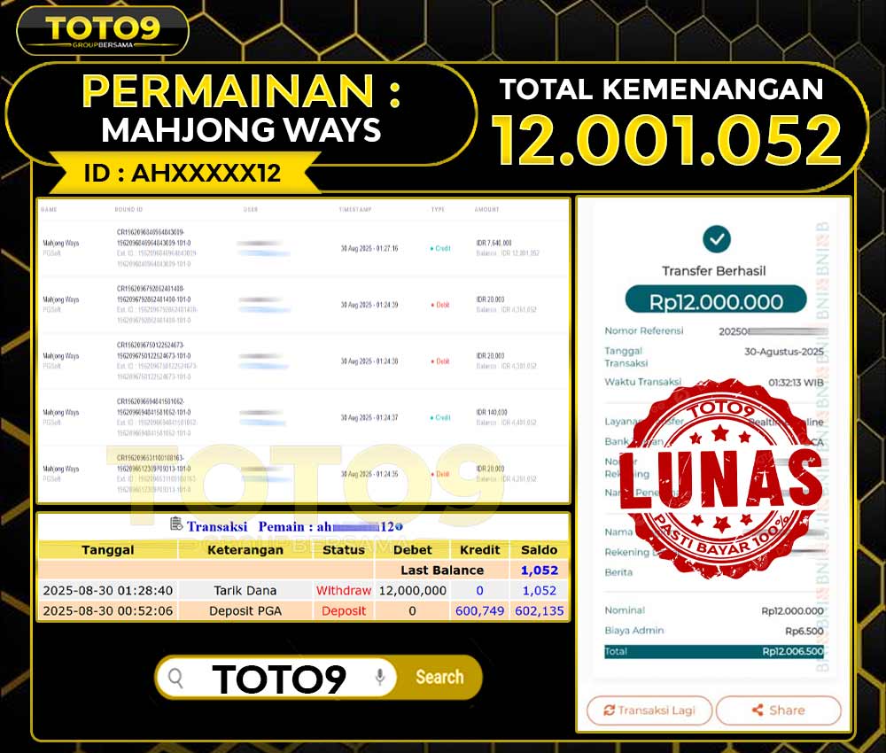 Selamat kepada User id : AH*****12 Telah berhasil mendapatkan kemenangan besar pada permainan slot game MAHJONG WAYS kemenangan Sebesar Rp.12.000.000, Setelah mengisi formulir withdraw dengan kurung waktu hanya 3 – 5 menit pihak toto9 sudah melakukan transfer kepada pemilik Userid dan dana sudah dapat di cairkan oleh pemenang. Bukti pembayaran yang kami berikan merupakan bukti pembayaran yang SAH / VALID yang langung di dapatkan melalui tanda transfer transaksi dari Bank yang di tuju.