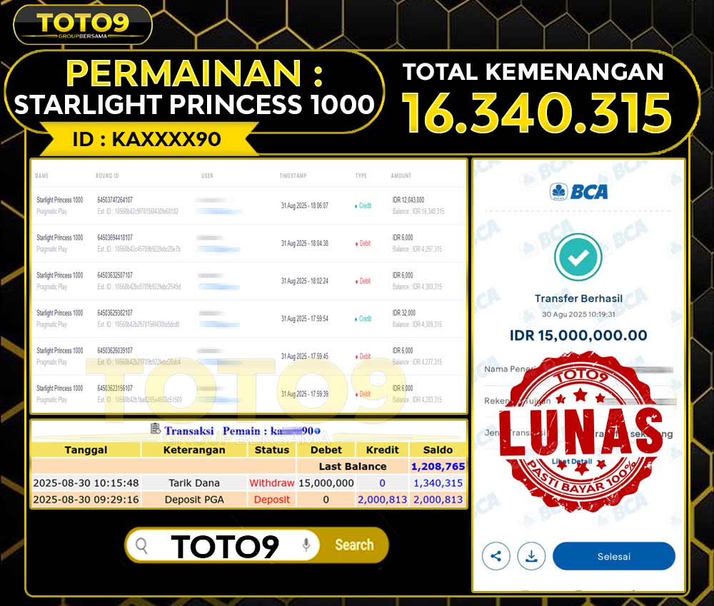 Selamat kepada User id : KA****90 Telah berhasil mendapatkan kemenangan besar pada permainan slot game MAHJONG WAYS kemenangan Sebesar Rp.16.340.315, Setelah mengisi formulir withdraw dengan kurung waktu hanya 3 – 5 menit pihak toto9 sudah melakukan transfer kepada pemilik Userid dan dana sudah dapat di cairkan oleh pemenang. Bukti pembayaran yang kami berikan merupakan bukti pembayaran yang SAH / VALID yang langung di dapatkan melalui tanda transfer transaksi dari Bank yang di tuju.