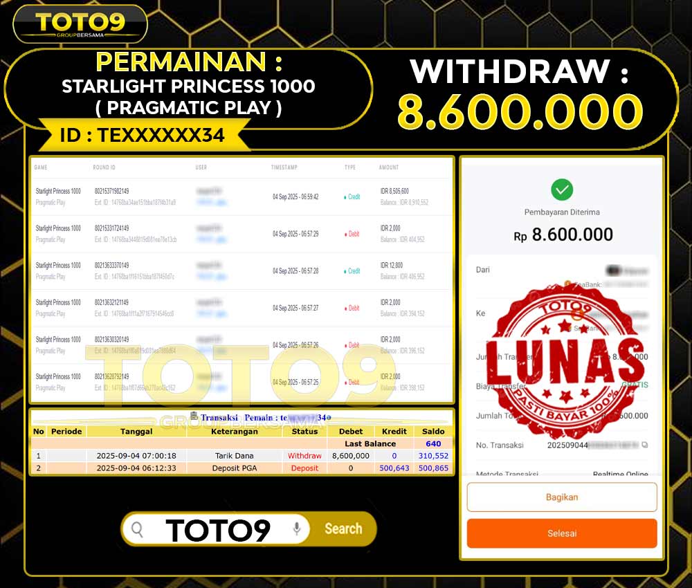 Selamat kepada User id : TE***34 Telah berhasil mendapatkan kemenangan besar pada permainan slot STARLIGHT PRINCESS 1000 kemenangan Sebesar Rp8.600.000 , Setelah mengisi formulir withdraw dengan kurung waktu hanya 3 – 5 menit pihak toto9 sudah melakukan transfer kepada pemilik Userid dan dana sudah dapat di cairkan oleh pemenang. Bukti pembayaran yang kami berikan merupakan bukti pembayaran yang SAH / VALID yang langung di dapatkan melalui tanda transfer transaksi dari Bank yang di tuju.