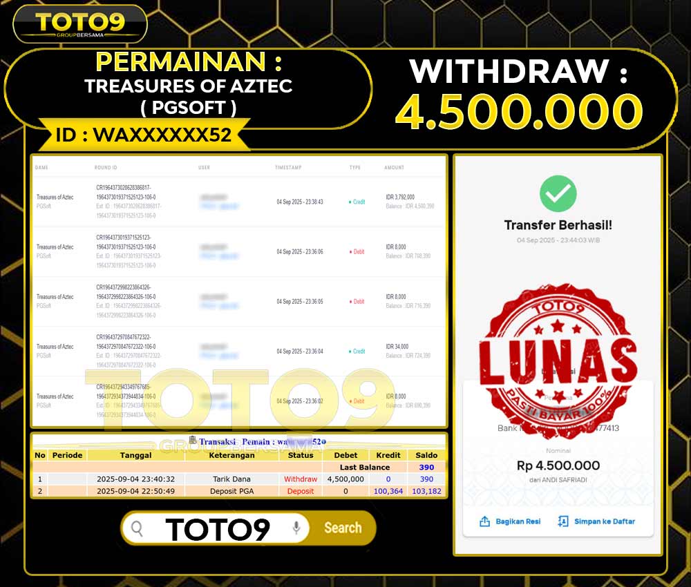 Selamat kepada User id : WA******52 Telah berhasil mendapatkan kemenangan besar pada permainan slot TREASURES OF AZTEC ( PGSOFT ) kemenangan Sebesar Rp4.500.000 , Setelah mengisi formulir withdraw dengan kurung waktu hanya 3 – 5 menit pihak toto9 sudah melakukan transfer kepada pemilik Userid dan dana sudah dapat di cairkan oleh pemenang. Bukti pembayaran yang kami berikan merupakan bukti pembayaran yang SAH / VALID yang langung di dapatkan melalui tanda transfer transaksi dari Bank yang di tuju.