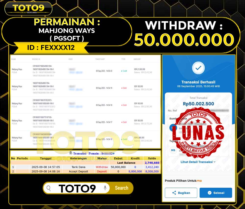 Selamat kepada User id : FE****12 Telah berhasil mendapatkan kemenangan besar pada permainan slot MAHJONG WAYS ( PGSOFT ) kemenangan Sebesar Rp50.000.000 , Setelah mengisi formulir withdraw dengan kurung waktu hanya 3 – 5 menit pihak toto9 sudah melakukan transfer kepada pemilik Userid dan dana sudah dapat di cairkan oleh pemenang. Bukti pembayaran yang kami berikan merupakan bukti pembayaran yang SAH / VALID yang langung di dapatkan melalui tanda transfer transaksi dari Bank yang di tuju.
