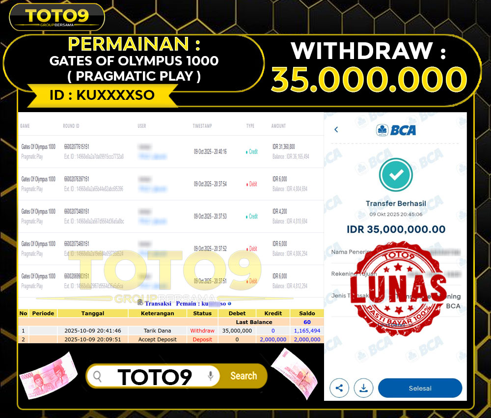 Selamat kepada User id : KU****SO Telah berhasil mendapatkan kemenangan besar pada permainan GATES OF OLYMPUS 1000 ( SLOT GAMES ) kemenangan Sebesar Rp35.000.000 , Setelah mengisi formulir withdraw dengan kurung waktu hanya 3 – 5 menit pihak TOTO9 sudah melakukan transfer kepada pemilik Userid dan dana sudah dapat di cairkan oleh pemenang. Bukti pembayaran yang kami berikan merupakan bukti pembayaran yang SAH / VALID yang langung di dapatkan melalui tanda transfer transaksi dari Bank yang di tuju.