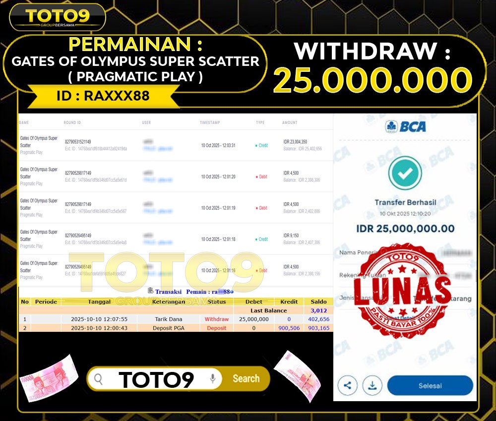 Selamat kepada User id : RA****88 Telah berhasil mendapatkan kemenangan besar pada permainan GATES OF OLYMPUS SUPER SCATTER ( SLOT GAMES ) kemenangan Sebesar Rp25.000.000 , Setelah mengisi formulir withdraw dengan kurung waktu hanya 3 – 5 menit pihak TOTO9 sudah melakukan transfer kepada pemilik Userid dan dana sudah dapat di cairkan oleh pemenang. Bukti pembayaran yang kami berikan merupakan bukti pembayaran yang SAH / VALID yang langung di dapatkan melalui tanda transfer transaksi dari Bank yang di tuju.