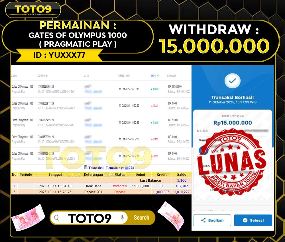 Selamat kepada User id : YU***77 Telah berhasil mendapatkan kemenangan besar pada permainan GATES OF OLYMPUS 1000 ( SLOT GAMES ) kemenangan Sebesar Rp15.000.000 , Setelah mengisi formulir withdraw dengan kurung waktu hanya 3 – 5 menit pihak TOTO9 sudah melakukan transfer kepada pemilik Userid dan dana sudah dapat di cairkan oleh pemenang. Bukti pembayaran yang kami berikan merupakan bukti pembayaran yang SAH / VALID yang langung di dapatkan melalui tanda transfer transaksi dari Bank yang di tuju.