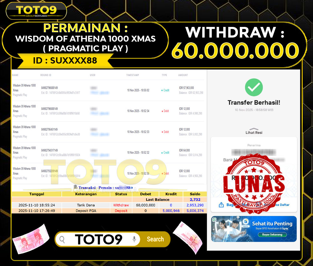 Selamat kepada User id : SU****88 Telah berhasil mendapatkan kemenangan besar pada permainan WISDOM OF ATHENA 1000 XMAS ( SLOT GAMES ) kemenangan Sebesar Rp60.000.000 , Setelah mengisi formulir withdraw dengan kurung waktu hanya 3 – 5 menit pihak TOTO9 sudah melakukan transfer kepada pemilik Userid dan dana sudah dapat di cairkan oleh pemenang. Bukti pembayaran yang kami berikan merupakan bukti pembayaran yang SAH / VALID yang langung di dapatkan melalui tanda transfer transaksi dari Bank yang di tuju.