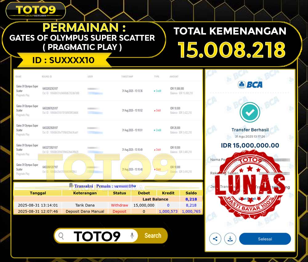 Selamat kepada User id : SU****10 Telah berhasil mendapatkan kemenangan besar pada permainan slot GATES OF OLYMPUS SUPER SCATTER WD kemenangan Sebesar  Rp 15.000.000 , Setelah mengisi formulir withdraw dengan kurung waktu hanya 3 – 5 menit pihak toto9 sudah melakukan transfer kepada pemilik Userid dan dana sudah dapat di cairkan oleh pemenang. Bukti pembayaran yang kami berikan merupakan bukti pembayaran yang SAH / VALID yang langung di dapatkan melalui tanda transfer transaksi dari Bank yang di tuju.