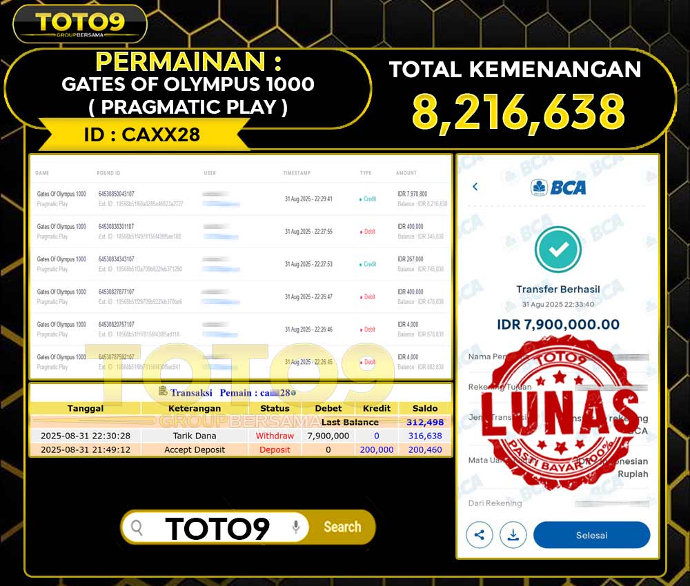 Selamat kepada User id : CA**28 Telah berhasil mendapatkan kemenangan besar pada permainan slot GATES OF OLYMPUS 1000 kemenangan Sebesar Rp 7.900.000 , Setelah mengisi formulir withdraw dengan kurung waktu hanya 3 – 5 menit pihak toto9 sudah melakukan transfer kepada pemilik Userid dan dana sudah dapat di cairkan oleh pemenang. Bukti pembayaran yang kami berikan merupakan bukti pembayaran yang SAH / VALID yang langung di dapatkan melalui tanda transfer transaksi dari Bank yang di tuju.